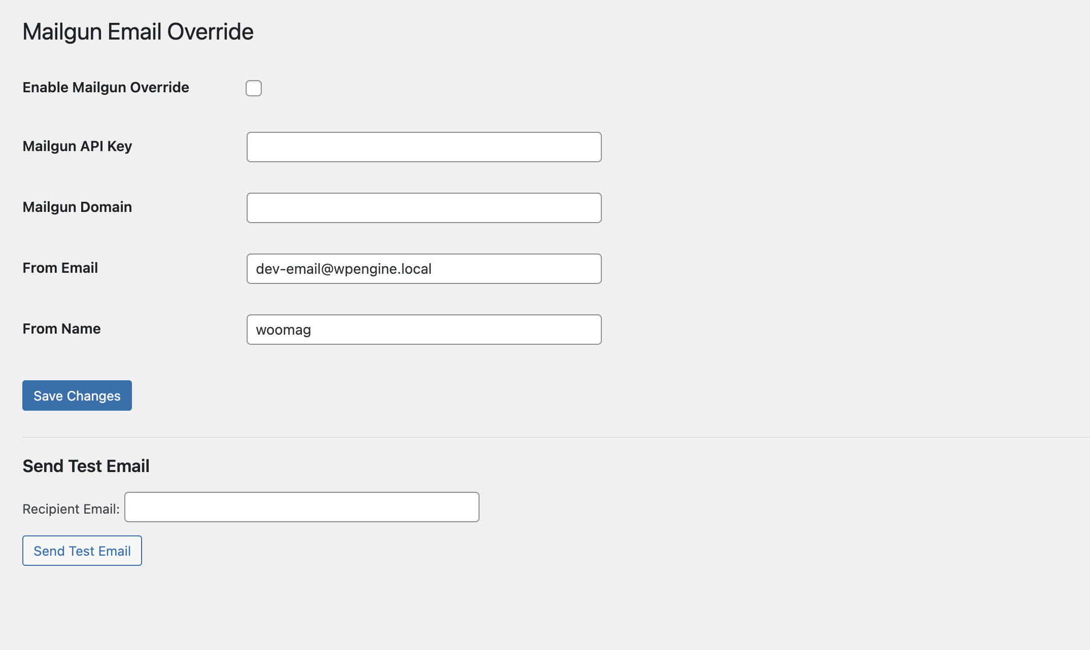 The plugin requires a valid Mailgun API key and domain to function. These credentials are stored in your WordPress database and used only to authenticate API requests to Mailgun.